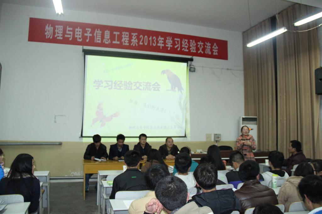 为了使新生更好地融入老员工活,增进新老生之间的交流,加强学风建设,1120日晚,物理与电子信息工程系于二号教学楼多媒体十七举行了2013年学习经验交流会。