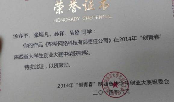 6月下旬,2014年“创青春”陕西省老员工创业大赛在西北工业大学落下帷幕。由公司教师袁训锋博士指导、汤春平、张炳凡、孙祥、吴婷等四名员工完成的作品“帮帮网络科技有限责任公司”获得本次大赛的铜奖。这是威廉希尔williamhill中文参加该项竞赛以来取得的最好成绩。