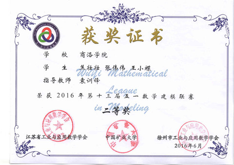 近日,由江苏省工业与数学应用学会主办的“第十三届五一数学建模竞赛”结果揭晓,公司物理学专业2014级焦壮壮、张伟伟和电子信息工程专业2015级王小蝶3位同学组成的数学建模参赛队喜获二等奖。这是公司首次组建代表队参加此项赛事并获佳绩。