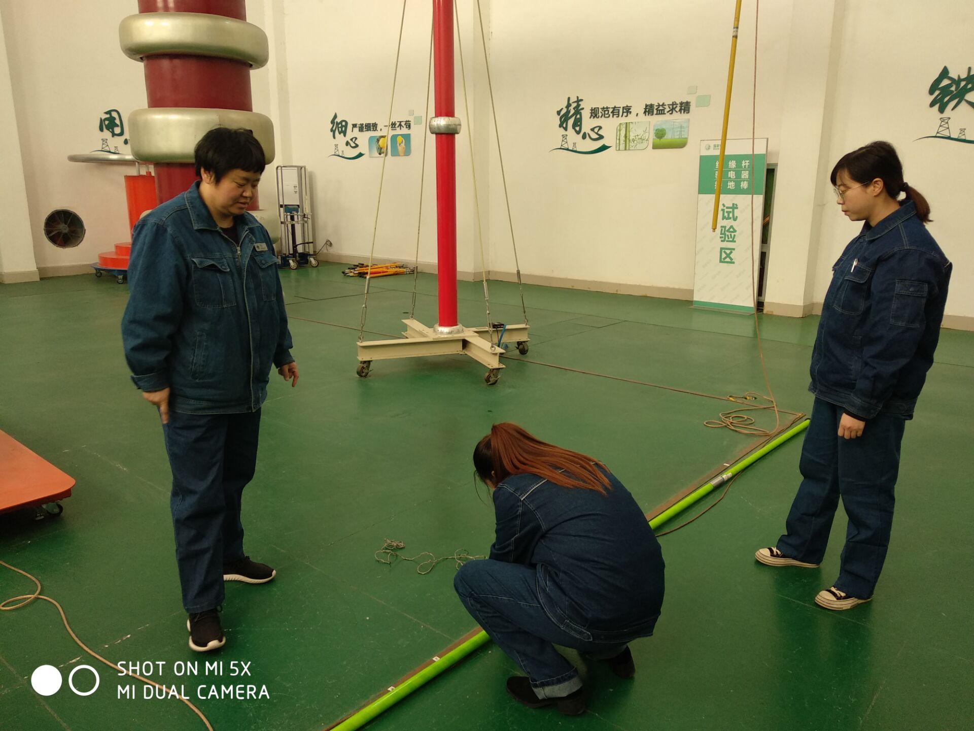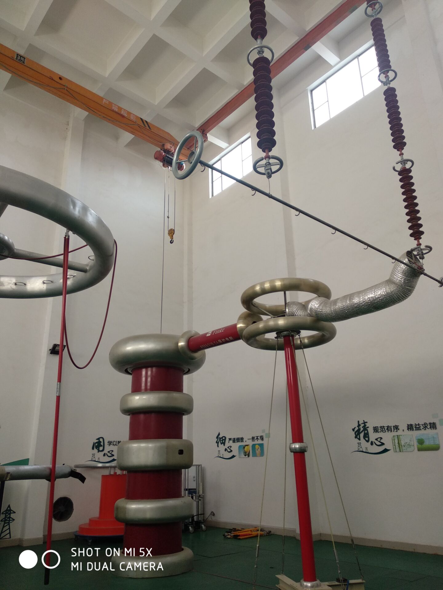 检修中心南主任首先带领我们重点参观了高压试验大厅并演示绝缘杆交流耐压试验,试验大厅面积225m2,设有专用的控制室和配电室。大厅主设备为450kV/225kVA无局放变压器一台,450kV电容分压器一台;控制部分采用国内先进的智能控制技术,交流耐压的全过程均可实现自动控制;系统的数据传输采用光纤技术,与强电隔离,保证了操作人员的安全。另外,大厅的东北角还配有绝缘靴、绝缘手套试验台一套。这座试验大厅现在可完成330kV及以下电压等级的绝缘杆、验电器、接地棒、绝缘靴、绝缘手套等绝缘安全工器具的试验,还可完成110kV及以下电压等级部分变电一次设备的交流耐压试验。