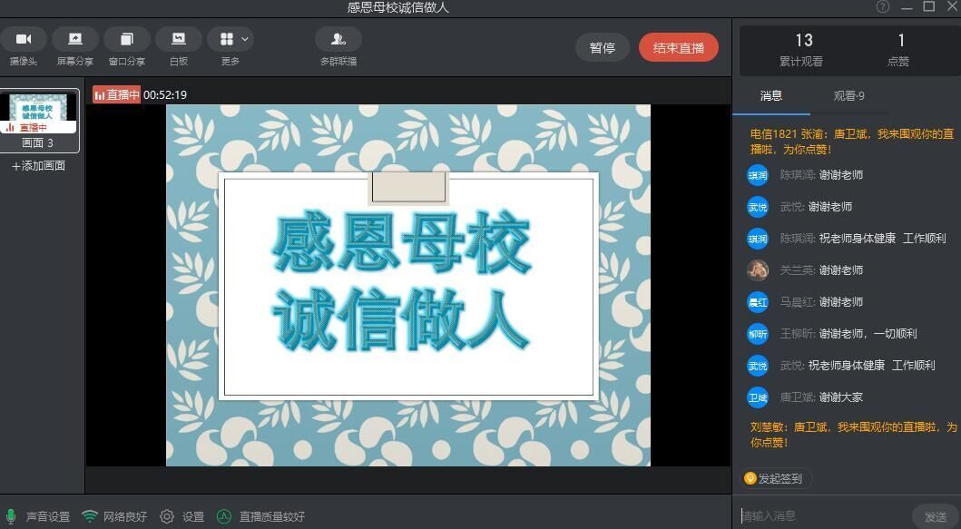 活动伊始,班主任老师和同学们一起回顾了大学四年生活的点滴,指出今年因为疫情影响,给我们的毕业教育形式带来了一些改变,但是母校对同学的祝福不变,同学们要心怀感恩,诚信前行。与会同学也表达了自己对公司的感恩感谢及不舍之情,坚定了诚信做人的信心。