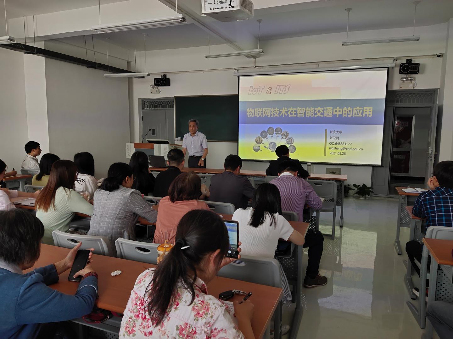 报告会上,张卫钢教授结合自己(团队)的科研项目,通俗易懂、由浅入深地从通信的概念、计算机网络、物联网技术、ITS系统、物联网在ITS中的应用等五个方面介绍了物联网相关技术研究和应用案例。报告会结束后,张卫钢与参会教师就团队建设、人才培养、科学研究等领域进行了深入的交流互动。