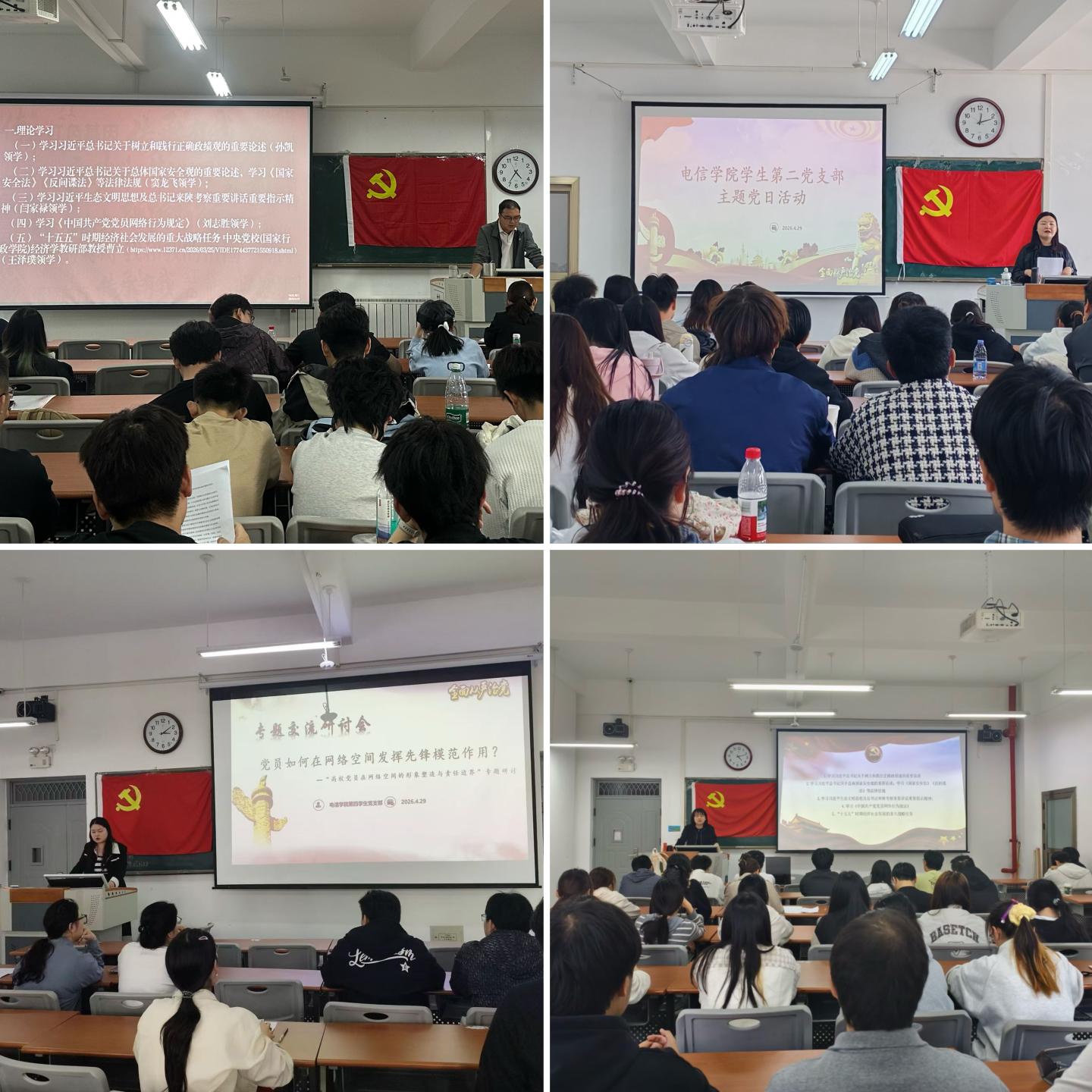 本次主题党日活动包括理论学习和研讨交流两个环节。在理论学习环节,各支部组织党员集中学习了习近平总书记关于树立和践行正确政绩观、总体国家安全观、习近平生态文明思想的重要论述和习近平总书记来陕考察重要讲话重要指示精神。同时,也组织党员学习了《中国共产党党员网络行为规定》《国家安全法》《反间谍法》等法律法规。在研讨交流环节,各支部围绕学习贯彻党的二十届四中全会精神和如何发挥党员在网络空间先锋模范作用两个主题,以“集中领学+交流发言+问题剖析+心得分享”的形式开展研讨交流。